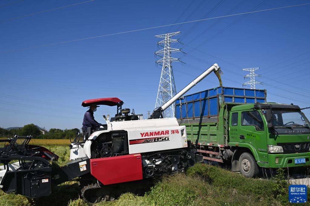 10月18日,湖州吳興八里店鎮尹家圩糧油植保農機專(zhuān)業(yè)合作社的農戶(hù)操作收割機將稻谷裝入轉運的貨車(chē)中。
