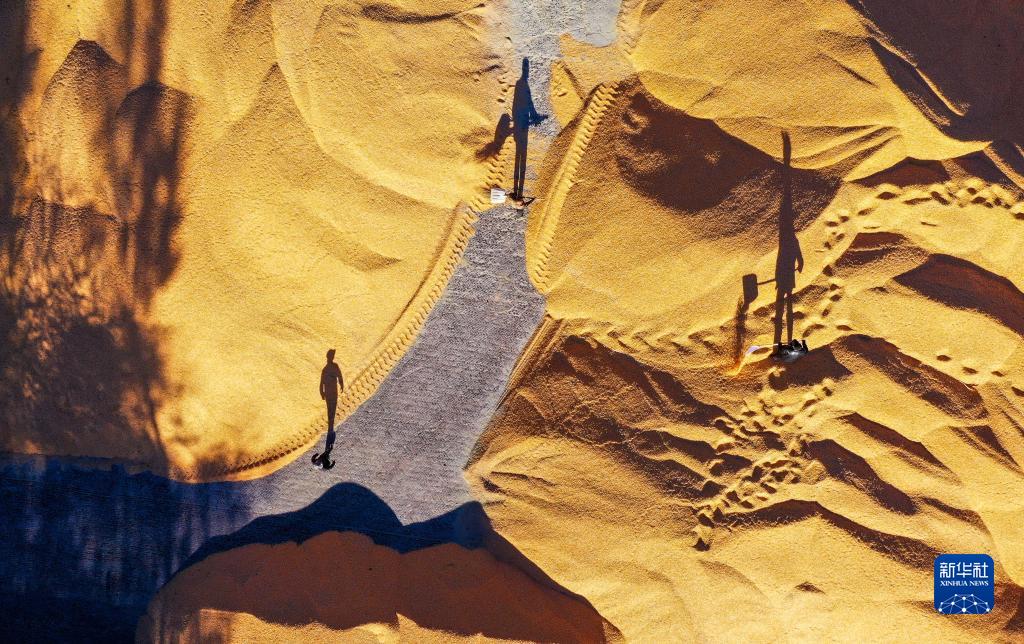 10月18日,在通遼市奈曼旗新鎮舍布日圖嘎查,工人在收糧站晾曬玉米(無(wú)人機照片)。