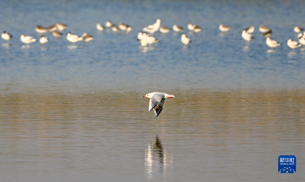 10月18日,在天津市寧河區七里海濕地自然保護區,一只紅嘴鷗在水面上覓食。
