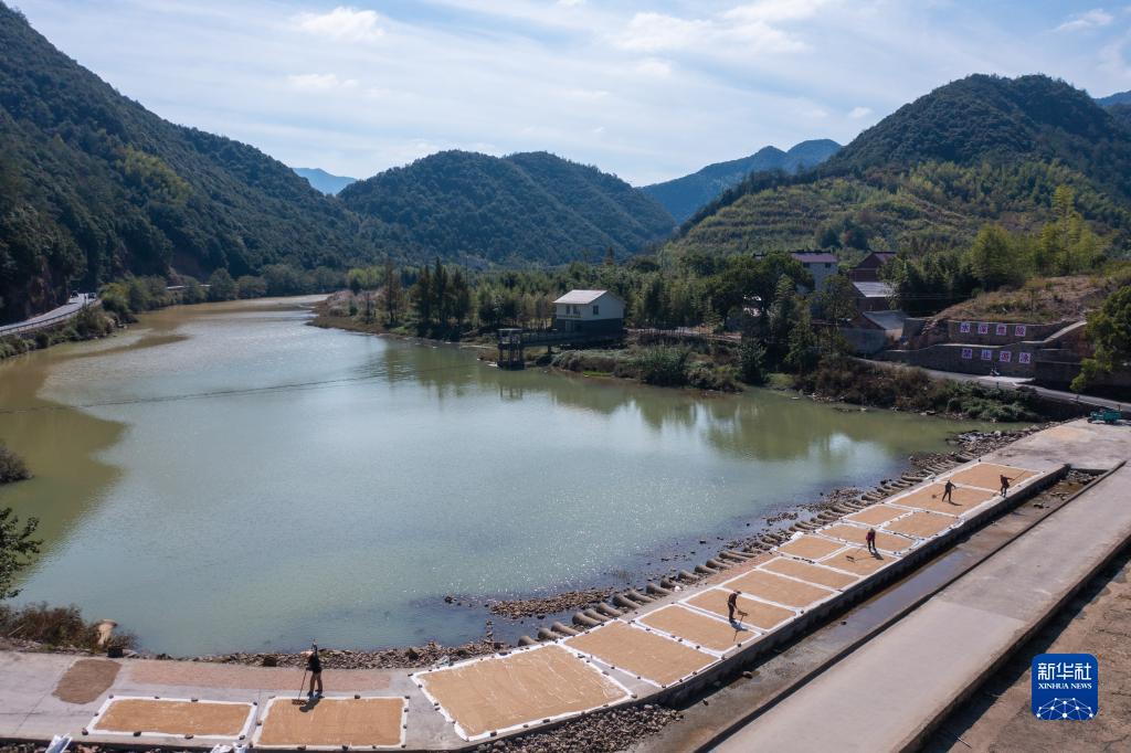 10月20日,杭州市富陽(yáng)區湖源鄉石龍村的農民在壺源溪畔晾曬收獲的稻谷(無(wú)人機照片)。