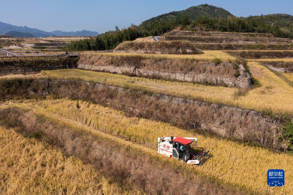 10月19日,在杭州市富陽(yáng)區新登鎮潘堰村,收割機在收割梯田水稻(無(wú)人機照片)。該村通過(guò)對低丘緩坡實(shí)施土地整理,建造梯田,同時(shí)采用防滲水膜節水法,建成了300畝左右“海綿農田”,雨季降水可以蓄積到農田下的地下隱形水庫供調劑使用。