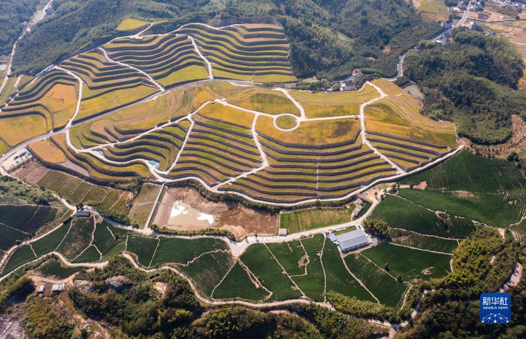 10月19日拍攝的杭州市富陽(yáng)區永昌鎮藍田灣的梯田水稻。這片梯田是由荒山改造建成的“海綿農田”,雨季降水可以蓄積到農田下的地下隱形水庫供調劑使用(無(wú)人機照片)。