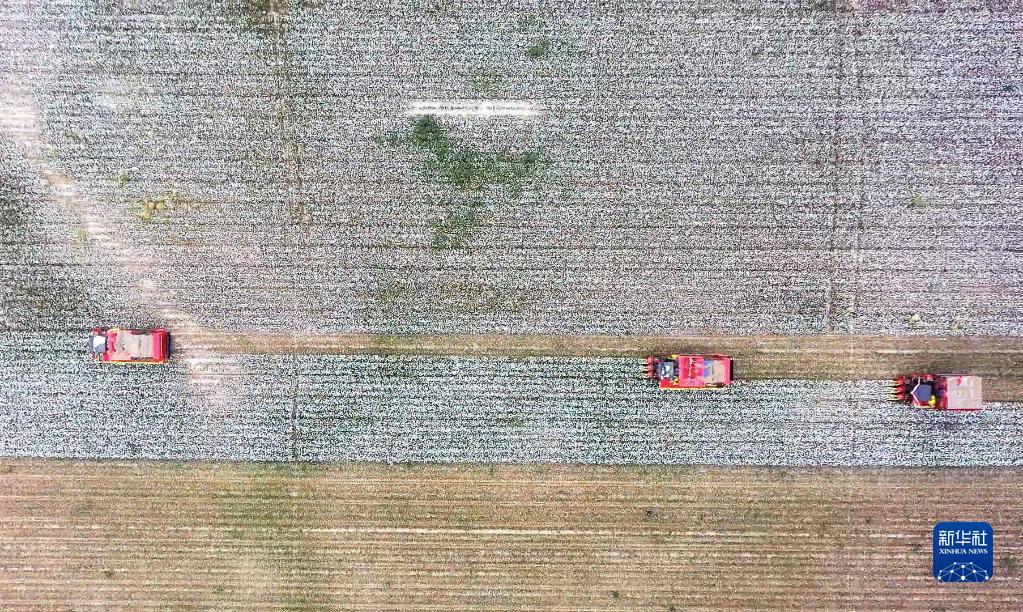 在新疆烏蘇市一處棉田里,采棉機在作業(yè)(10月14日攝,無(wú)人機照片)。