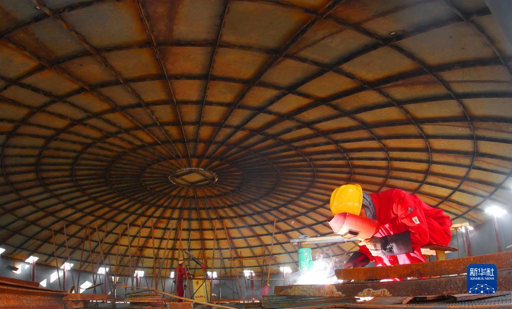 在中石化天津南港乙烯項目建設現場(chǎng),施工人員在進(jìn)行污水罐焊接作業(yè)(9月23日攝)。
