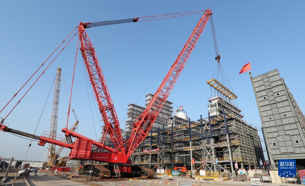 在中石化天津南港乙烯項目建設現場(chǎng),施工人員在安裝裂解爐模塊(10月7日攝)。