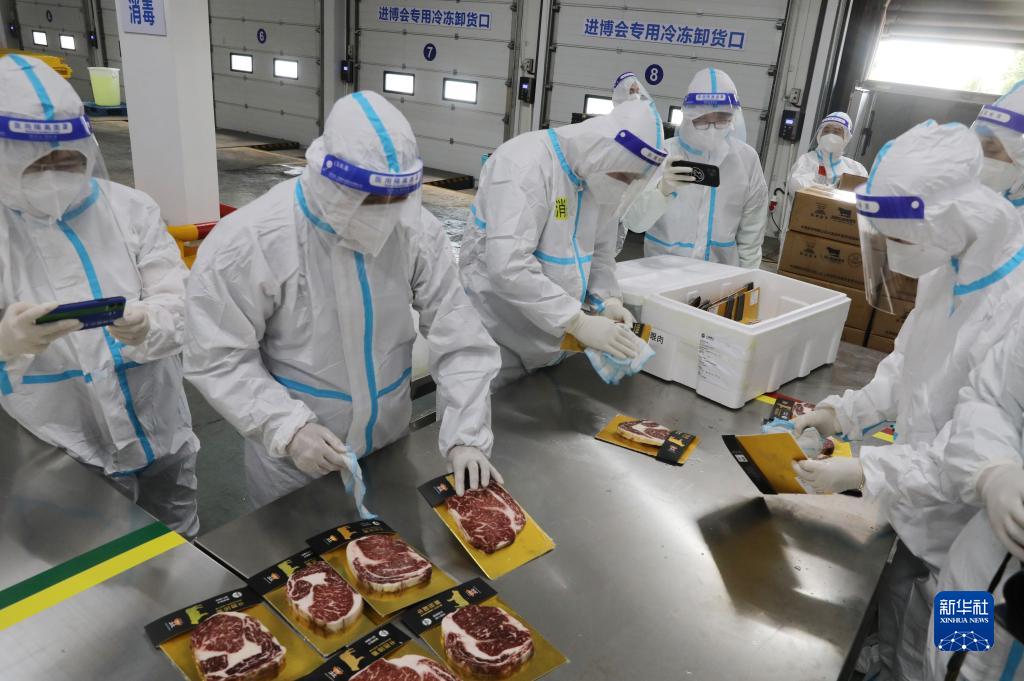 10月20日,工作人員在總倉內對第一批入倉的進(jìn)口冷鏈食品展品進(jìn)行小包裝分裝。