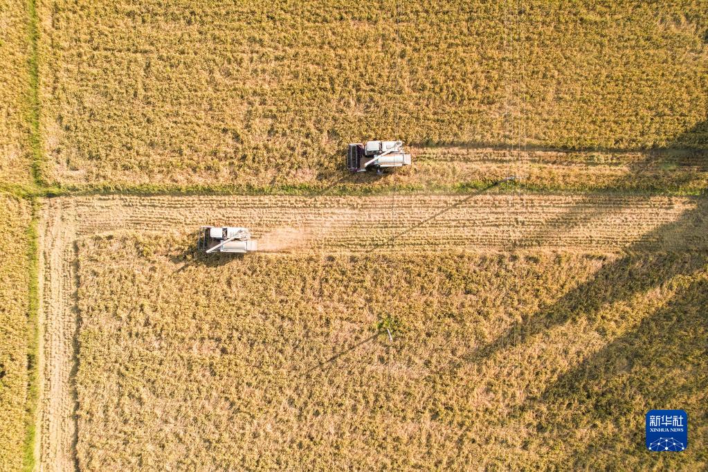 10月19日,在湖南省常德市安鄉縣三岔河鎮,農民駕駛農機收割晚稻(無(wú)人機照片)。