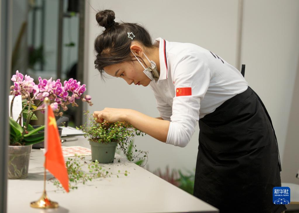 10月20日,上海農林職業(yè)技術(shù)學(xué)院楊靈芝在芬蘭首都赫爾辛基參加2022年世界技能大賽特別賽芬蘭賽區比賽花藝項目。新華社發(fā)(卡勒·帕爾基寧攝)