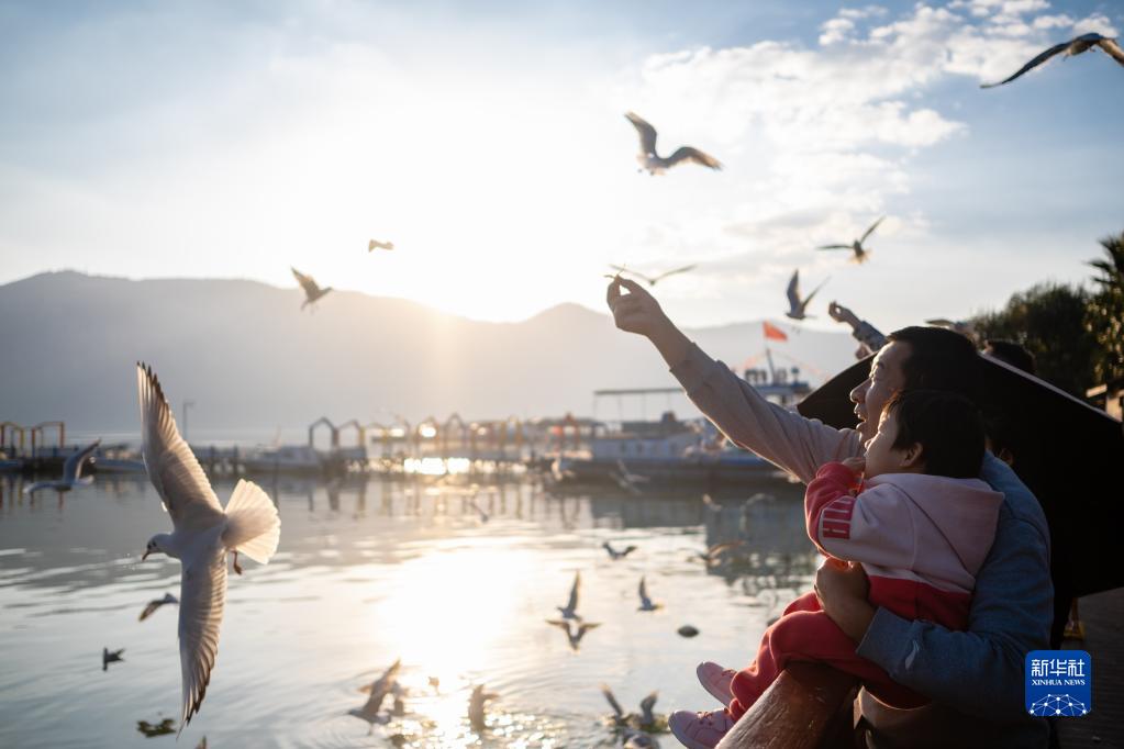 10月20日,市民在滇池畔投喂紅嘴鷗。 新華社記者 王冠森 攝