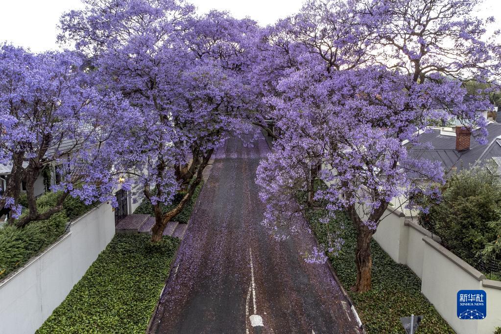 這是10月24日在南非約翰內斯堡拍攝的盛開(kāi)的藍花楹(無(wú)人機照片)。