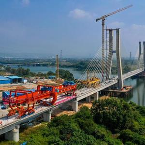 10月25日,施工人員操作架橋機將最后一孔900噸箱梁成功架設在增江特大橋橋墩上(無(wú)人機照片)。