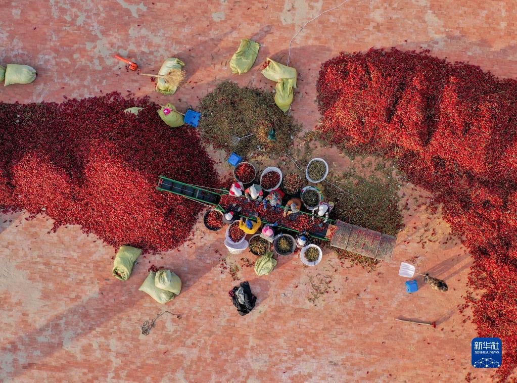 10月25日,在開(kāi)魯縣東風(fēng)鎮,工作人員分揀處理紅干椒(無(wú)人機照片)。