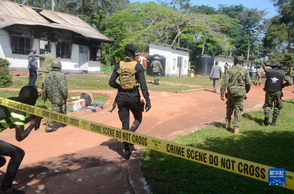 10月25日,在烏干達中部穆科諾地區一所盲人學(xué)校,安全人員在火災現場(chǎng)執勤。