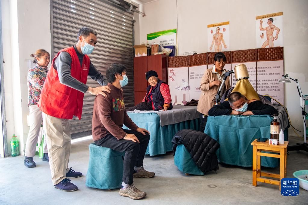 在重慶市綦江區安穩鎮崇河村“自然健康屋”,志愿者為老人提供免費理療服務(wù)(10月18日攝)?!白匀唤】滴荨笔钱數孛裾块T(mén)建立的普惠養老場(chǎng)所。
