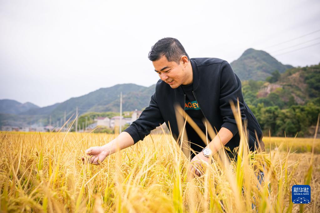 10月26日,建德市三都鎮新和村種糧大戶(hù)劉奕在稻田里查看成熟的稻穗。