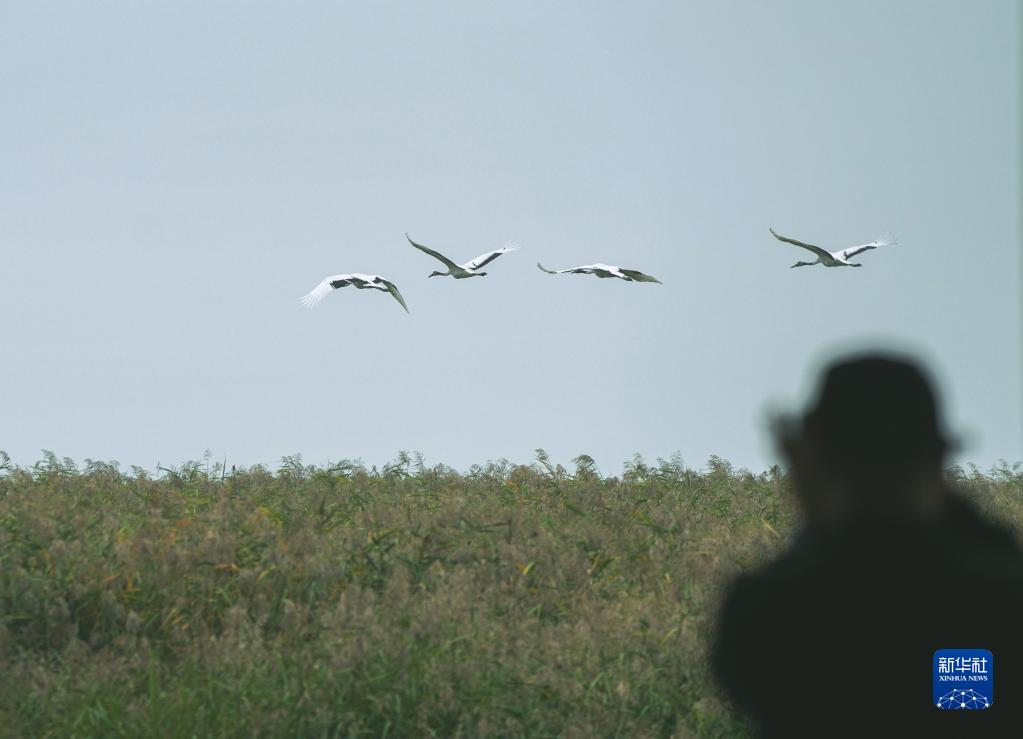 一名攝影愛(ài)好者在遼河口國家級自然保護區拍攝丹頂鶴(2022年10月2日攝)。