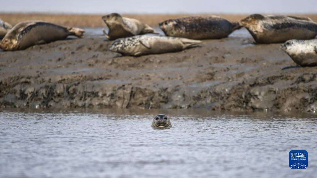 在遼寧盤(pán)錦遼河入??谌罍虾S?,一頭斑海豹從水中探出頭(2019年3月28日攝)。