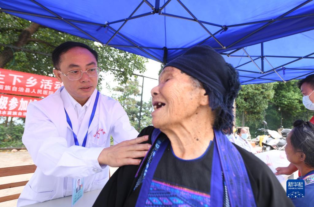 10月26日,在融水縣白云鄉幫陽(yáng)村,來(lái)自廣東醫科大學(xué)附屬醫院的周仲佑博士(左)在給老人提供醫療服務(wù)。