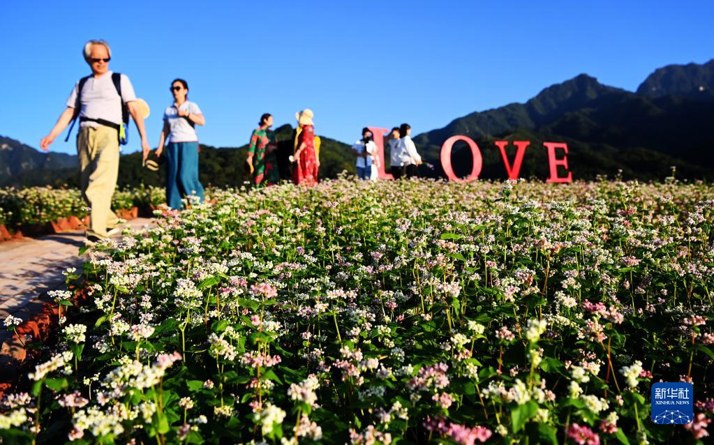 游人在西安市藍田縣九間房鎮峪口村蕎麥花海農業(yè)景區游覽(9月28日攝)。