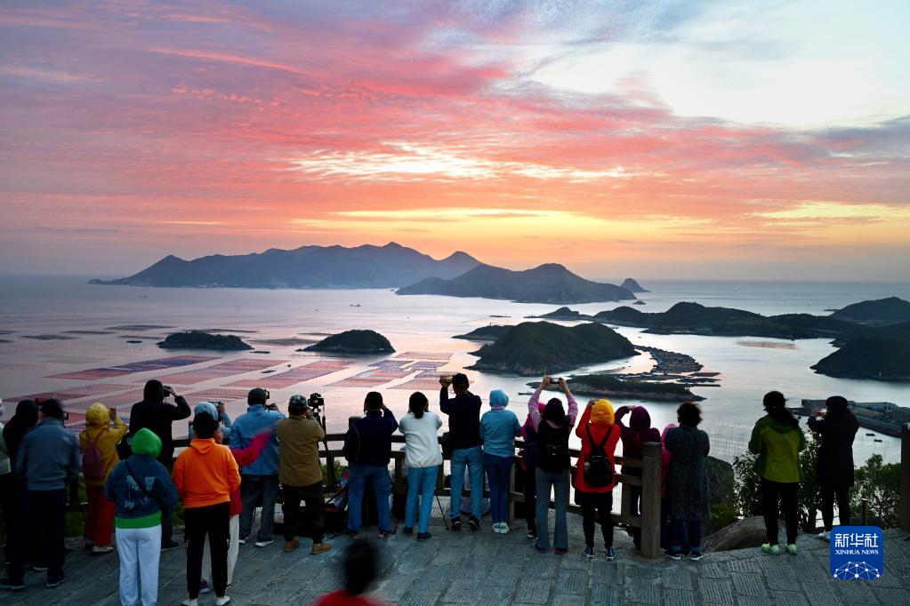 游客在福建省霞浦縣三沙鎮花竹村海邊拍攝海上養殖區日出景觀(guān)(10月26日攝)。