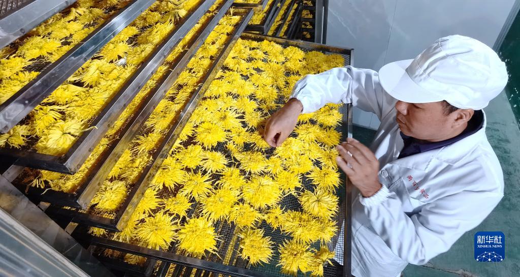 10月27日,岳林村皇菊種植基地員工查看菊花烘干情況。