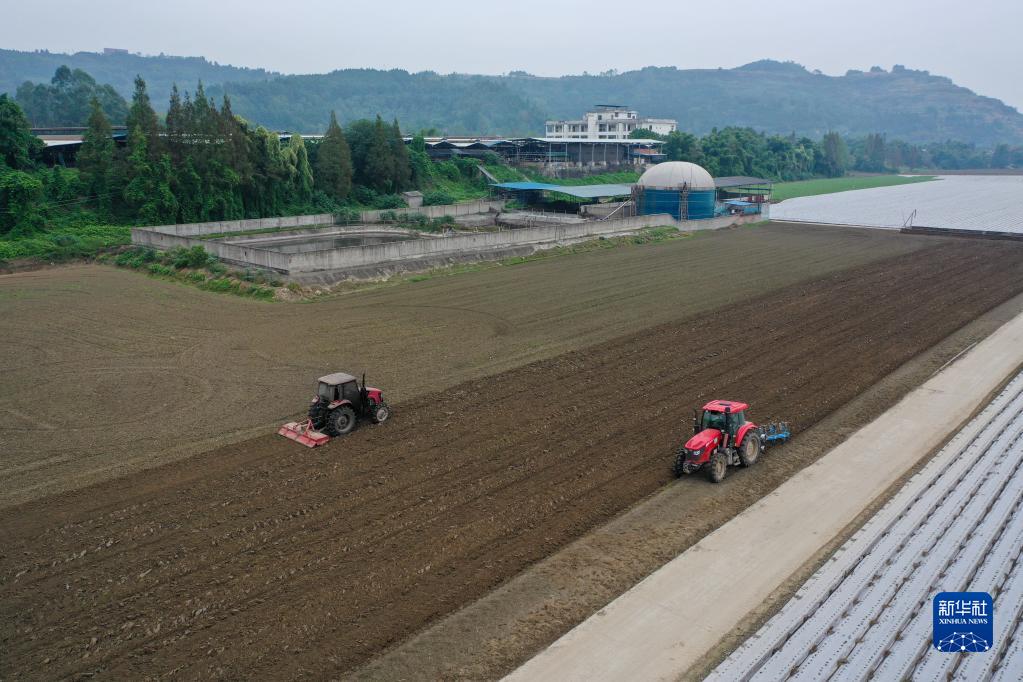在重慶市合川區太和鎮米市村的蘿卜種植基地,種植戶(hù)在駕駛農用機械犁地(2022年10月13日攝,無(wú)人機照片)。當地養殖戶(hù)按照標準直接將糞污處理后轉化為有機肥,提供給種植戶(hù)。