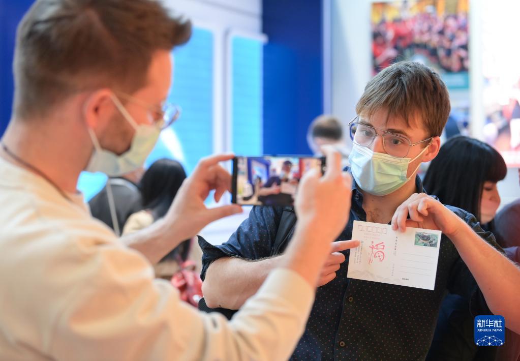 10月27日,外國嘉賓在互動(dòng)體驗展臺前拍攝在明信片上蓋的印戳。新華社記者 李賀 攝