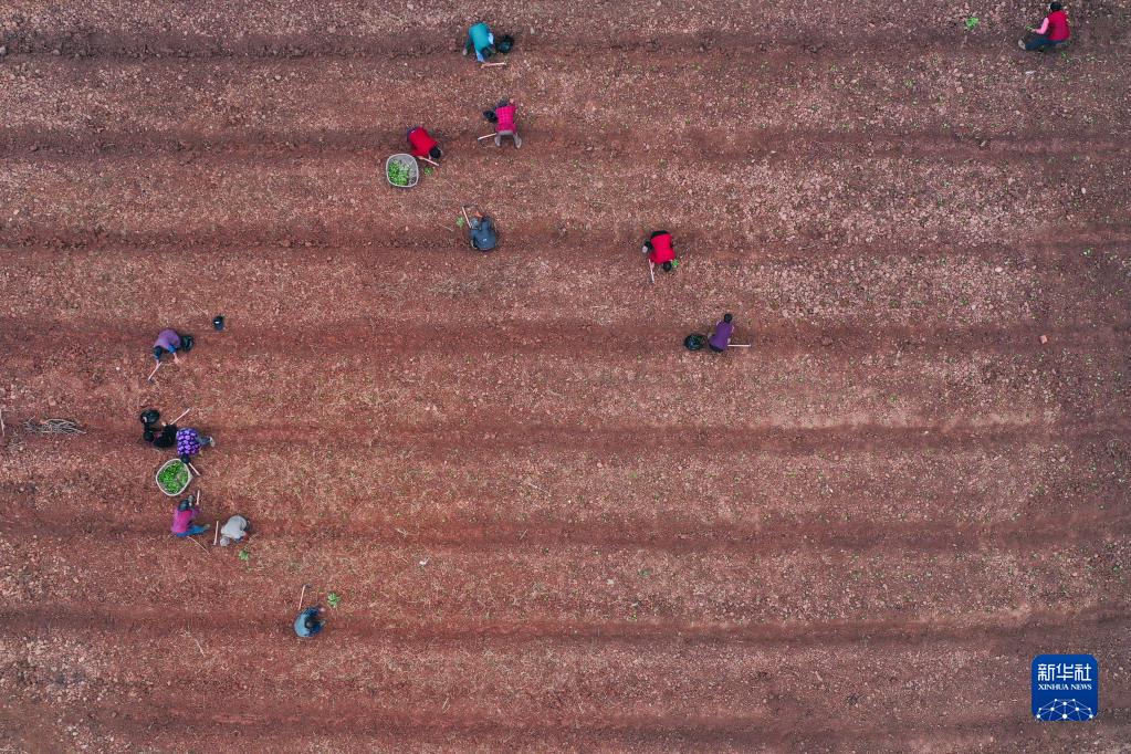 10月27日,在重慶大足區玉龍鎮清源村,村民在中藥材種植基地栽種車(chē)前草(無(wú)人機照片)。
