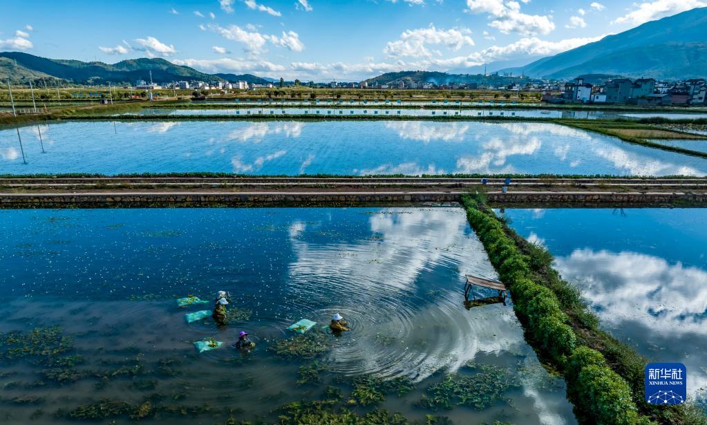 農戶(hù)在云南省大理白族自治州洱源縣右所鎮松曲村海菜田內忙碌(10月27日攝,無(wú)人機照片)。