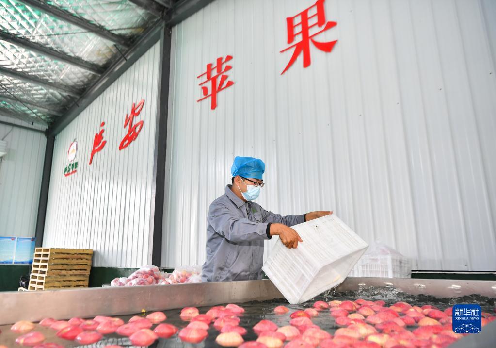 10月27日,在陜西省延安市安塞區南溝村,工作人員在蘋(píng)果洗選車(chē)間將蘋(píng)果放入分揀設備。 新華社記者 張博文 攝