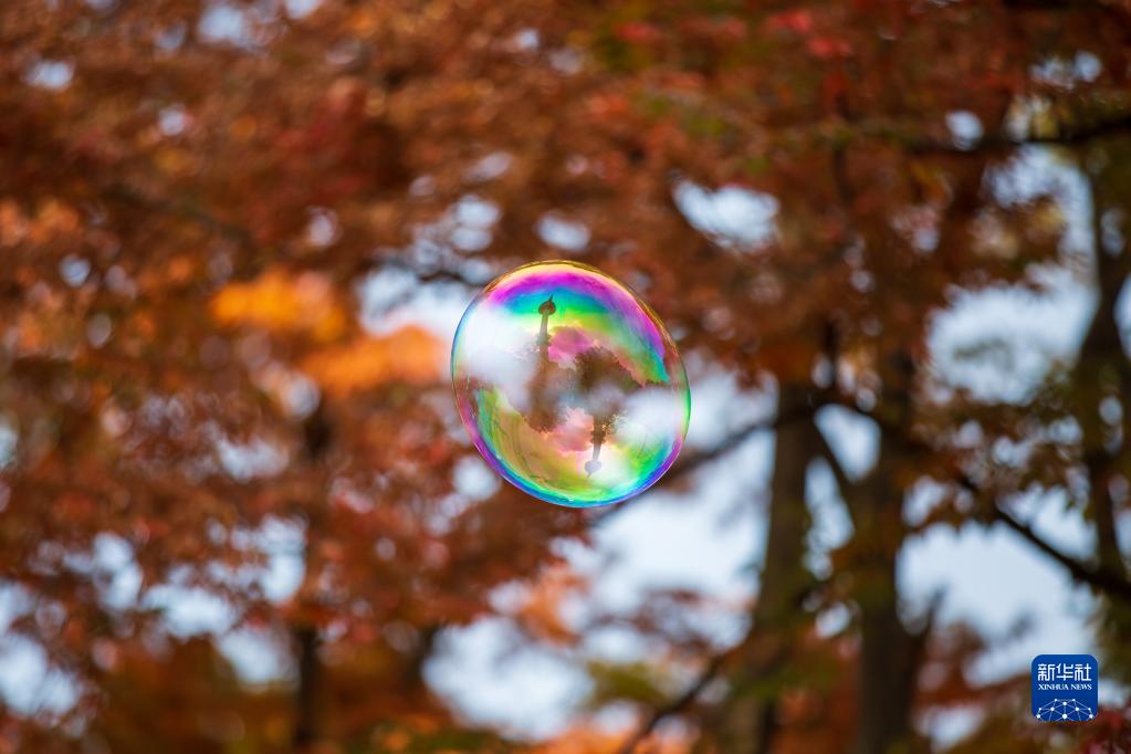 這是10月23日在韓國首爾南山公園拍攝的映射出首爾塔的肥皂泡。