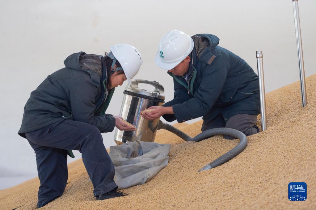 10月28日,在中央儲備糧哈爾濱直屬庫有限公司,工作人員用扦樣器對新收購入庫的大豆進(jìn)行取樣,以便后續檢測以了解其水分、雜質(zhì)以及蟲(chóng)害等情況。
