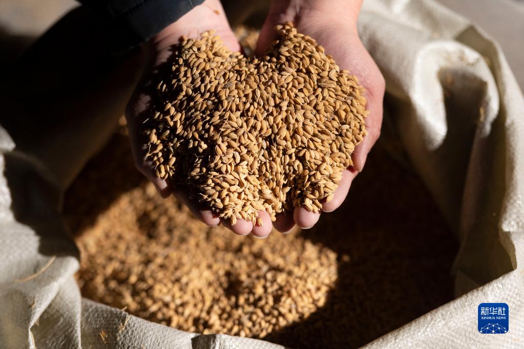 10月28日,在中央儲備糧哈爾濱直屬庫有限公司,工作人員查看新收購的水稻。