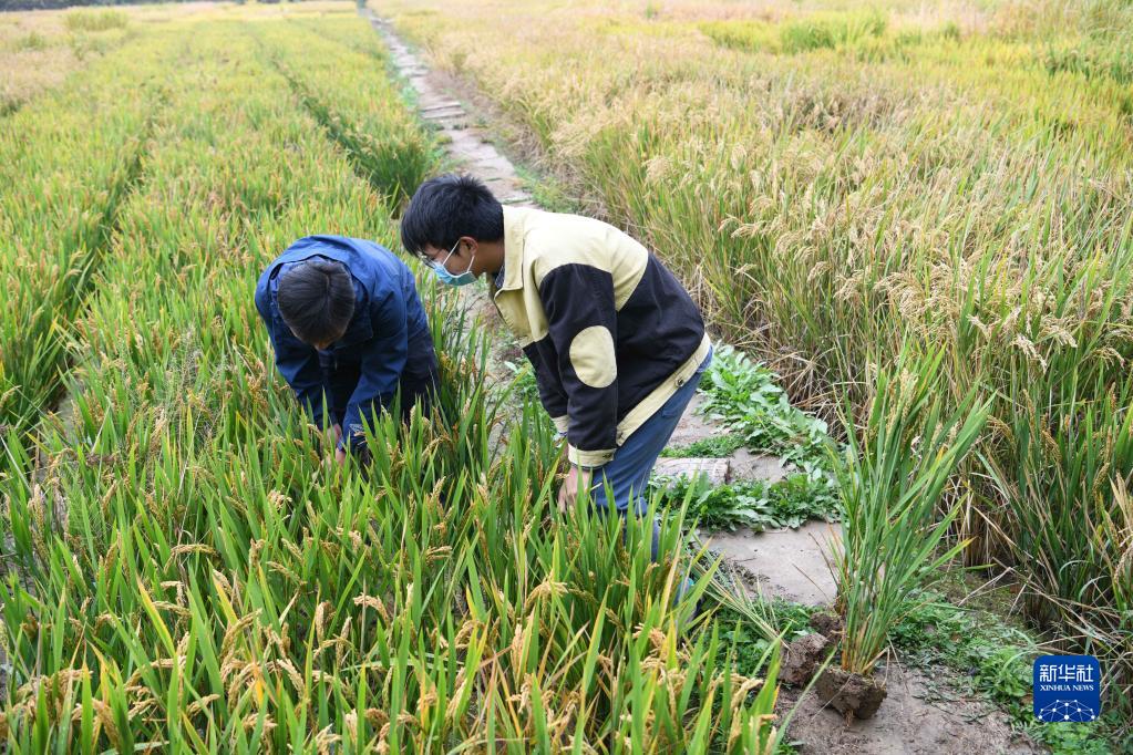 10月27日,在中科院合肥研究院智能所離子束生物工程與綠色農業(yè)研究中心的育種基地里,副研究員葉亞峰(左)選取用于實(shí)驗的水稻。