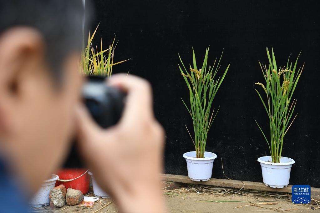 10月27日,在中科院合肥研究院智能所離子束生物工程與綠色農業(yè)研究中心的育種基地,副研究員葉亞峰給用于科研的水稻拍照。