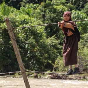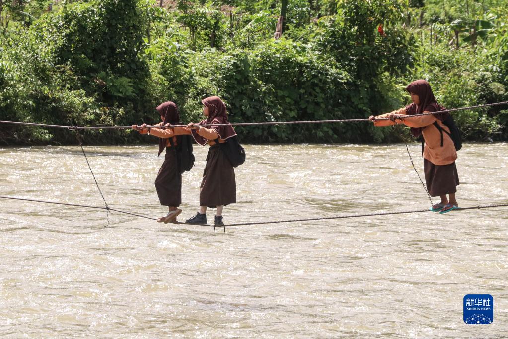 在印度尼西亞西亞齊地區,部分村落的孩子們需要通過(guò)鋼索橫跨河流上學(xué)。