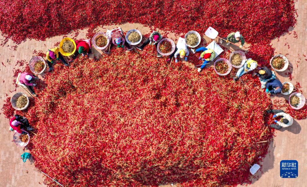 10月25日,在內蒙古通遼市開(kāi)魯縣東風(fēng)鎮東方紅村,工作人員分揀處理紅干椒(無(wú)人機照片)。