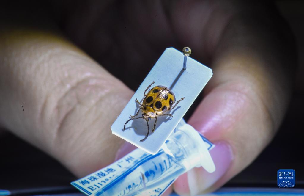 這是在廣州海珠濕地發(fā)現的一個(gè)昆蟲(chóng)新物種——海珠斯螢葉甲的標本(2021年10月25日攝)。
