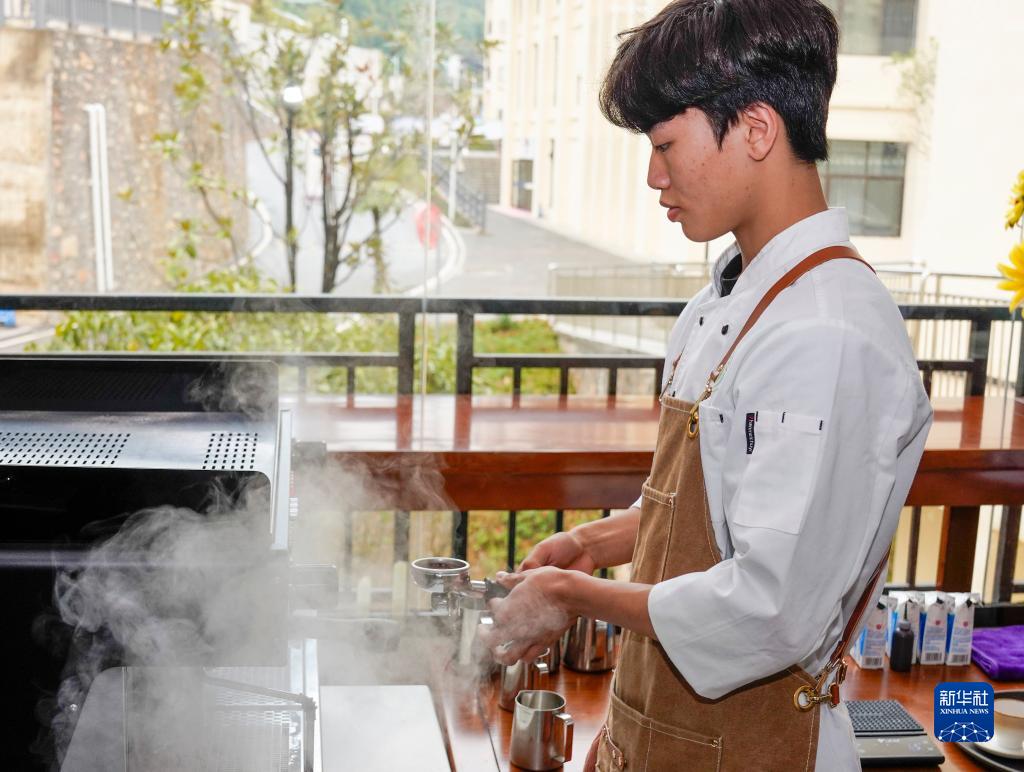10月27日,重慶市黔江區民族職業(yè)教育中心的學(xué)生在練習制作咖啡。