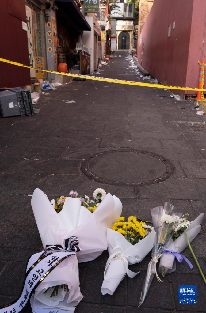 這是10月30日在韓國首爾踩踏事故現場(chǎng)拍攝的悼念鮮花。