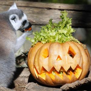 10月30日,在意大利羅馬動(dòng)物園,環(huán)尾狐猴享用節日南瓜。