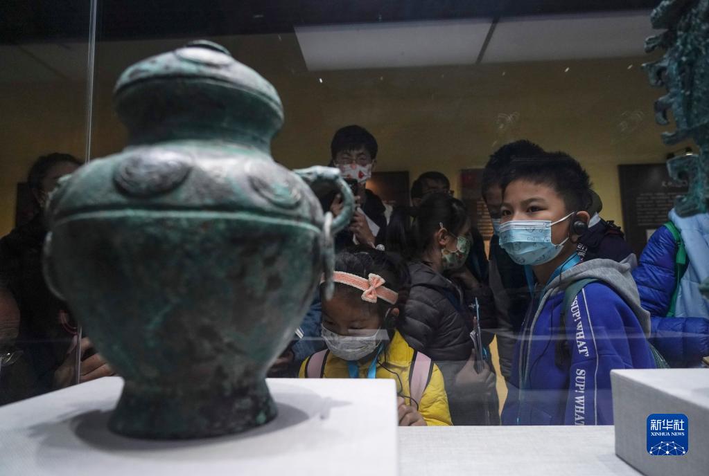 10月30日,小朋友在北京考古遺址博物館琉璃河遺址館區觀(guān)看文物克罍。