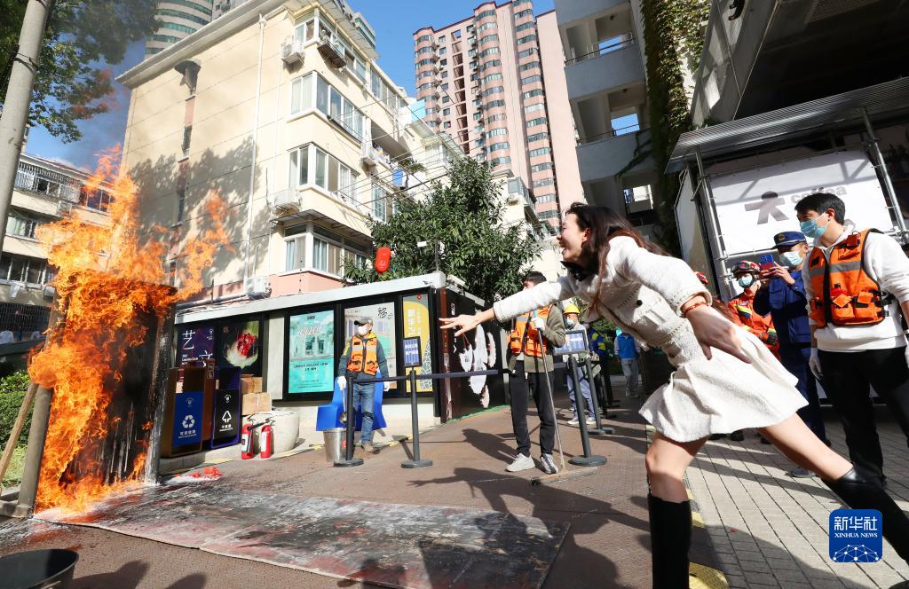 10月31日,市民在體驗使用應急滅火逃生瓶滅火。