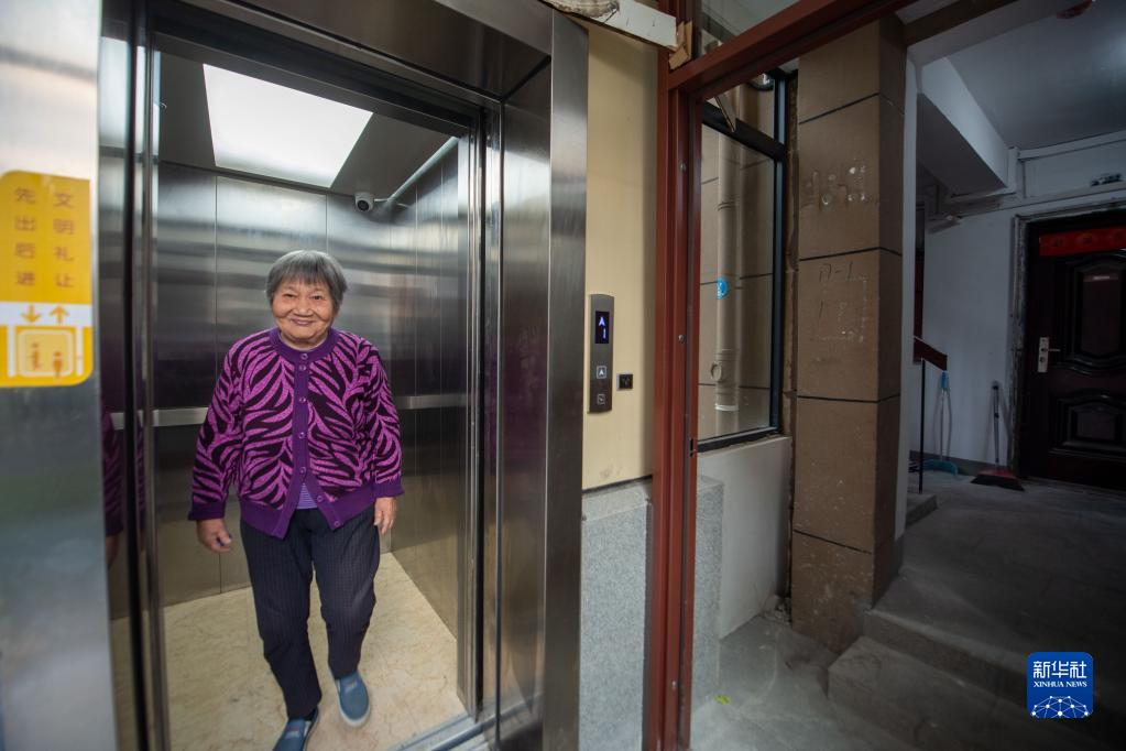 11月1日,松木場(chǎng)社區一名老年居民乘坐電梯。