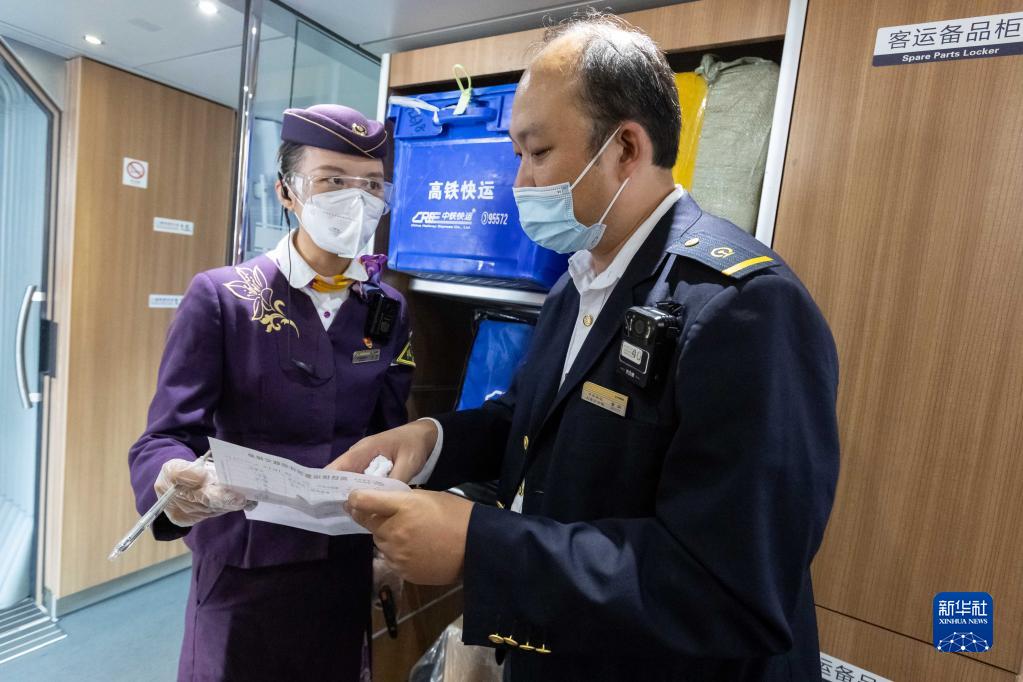 11月1日,在G1373次列車(chē)上,鐵路站車(chē)工作人員交接貨物清單。