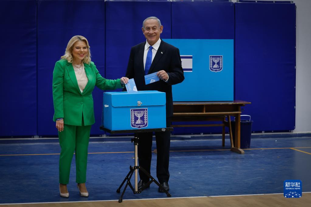 11月1日,以色列前總理內塔尼亞胡(右)與妻子在耶路撒冷一處投票站參與議會(huì )選舉投票。