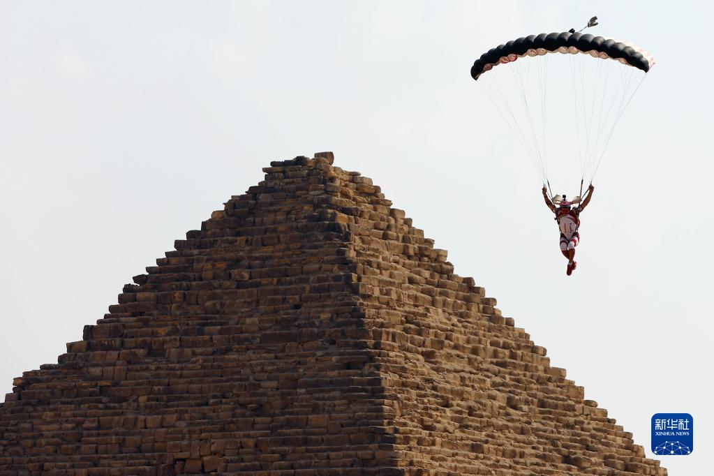 11月2日,在埃及吉薩金字塔景區,運動(dòng)員進(jìn)行跳傘表演。