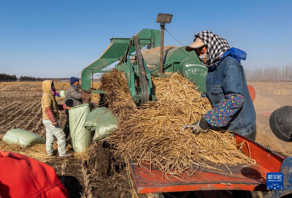 11月2日,在黑龍江省五常市的稻田中,農戶(hù)將收割的水稻脫粒。