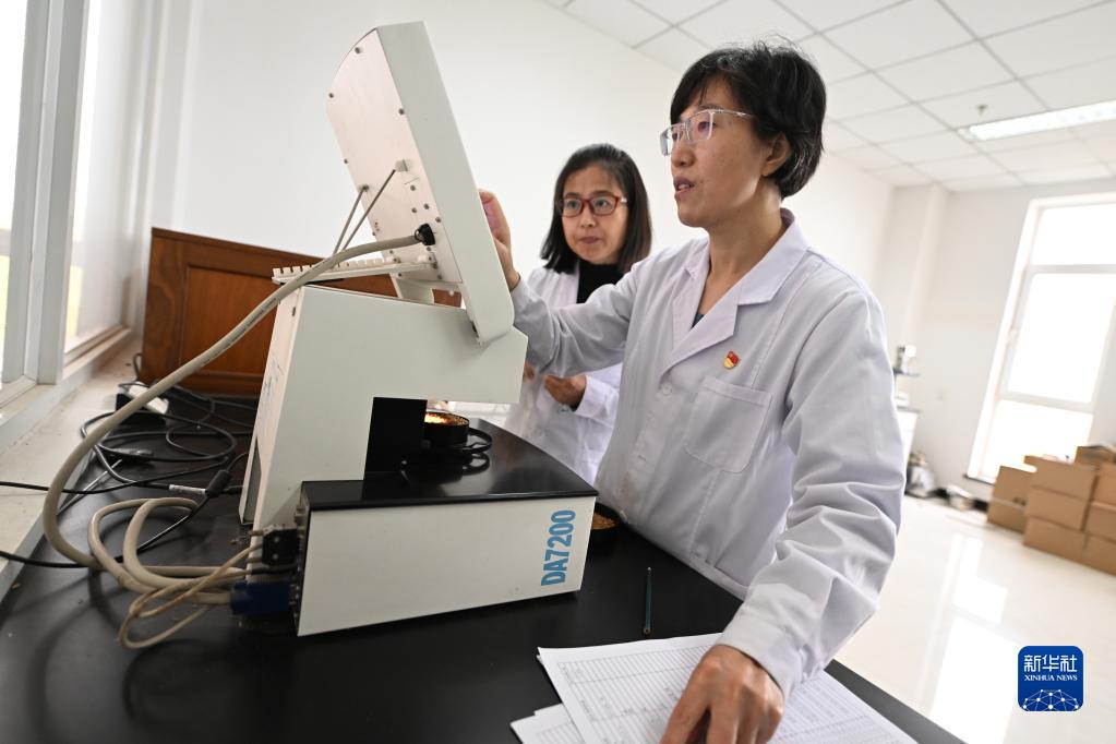 11月2日,在天津市農業(yè)科學(xué)院農作物研究所,時(shí)曉偉(右)與課題組同事利用科研設備全籽粒分析小麥品質(zhì)。