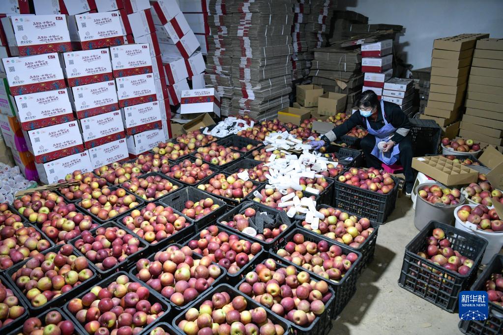 11月2日,果農在貴州省威寧縣牛棚鎮一合作社里包裝蘋(píng)果。